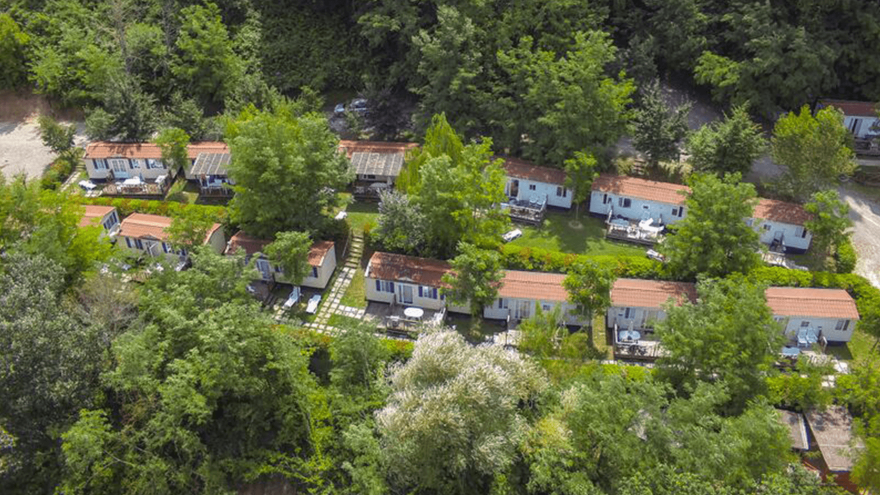 33 mobil-homes de 5 à 7 pers. climatisés*, équipés d’une salle de bain, d’un coin repas, d’une kitchenette et d’une terrasse avec mobilier de jardin.